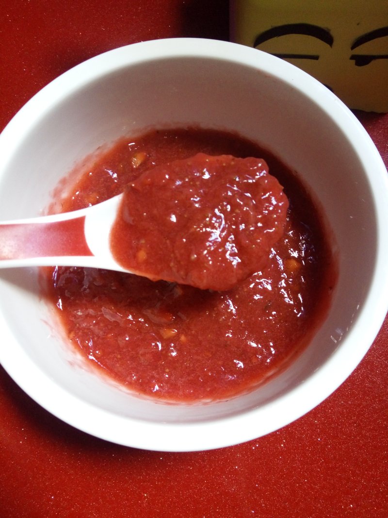 8:舀一勺草莓酱,草莓酱是自制的,比较稠,加少许凉白开调稀点。