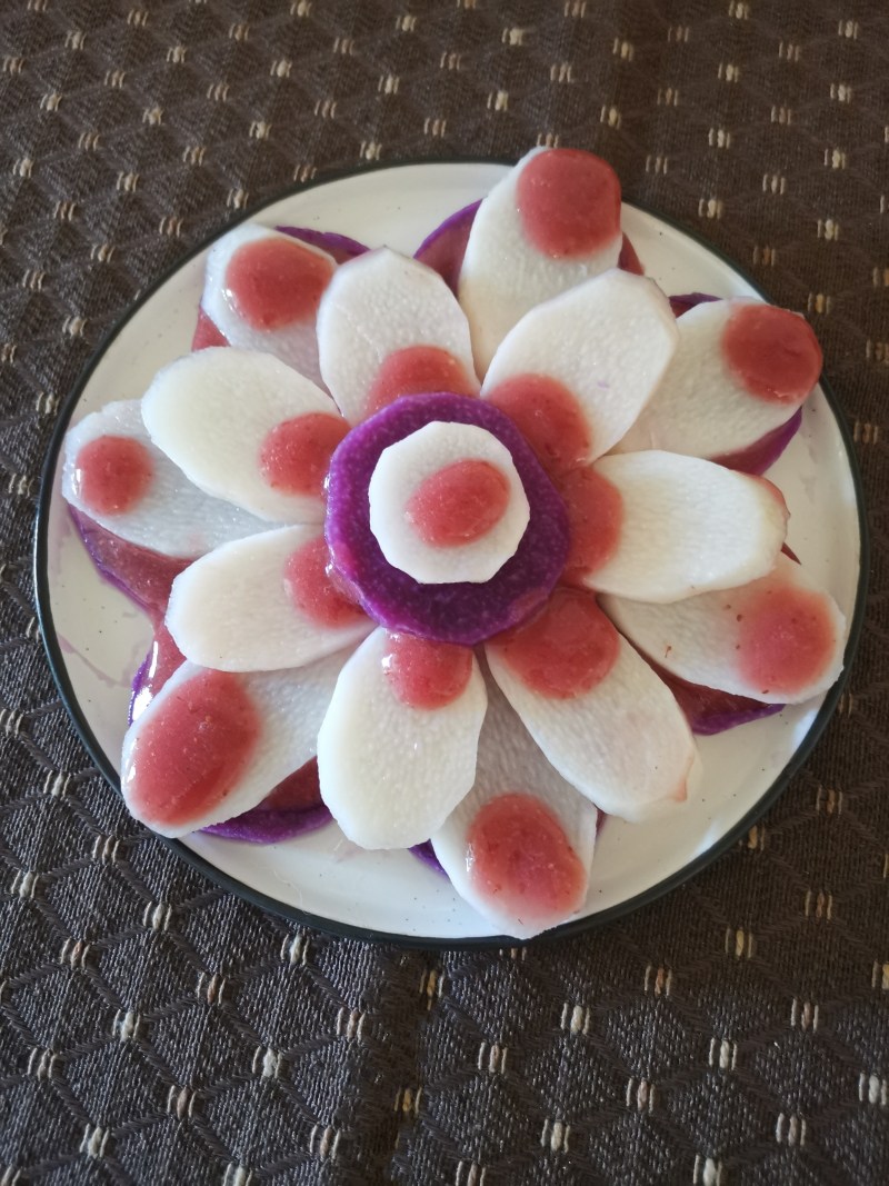 10:再将铁棍山药摆在紫山药上,然后淋上草莓酱即可。