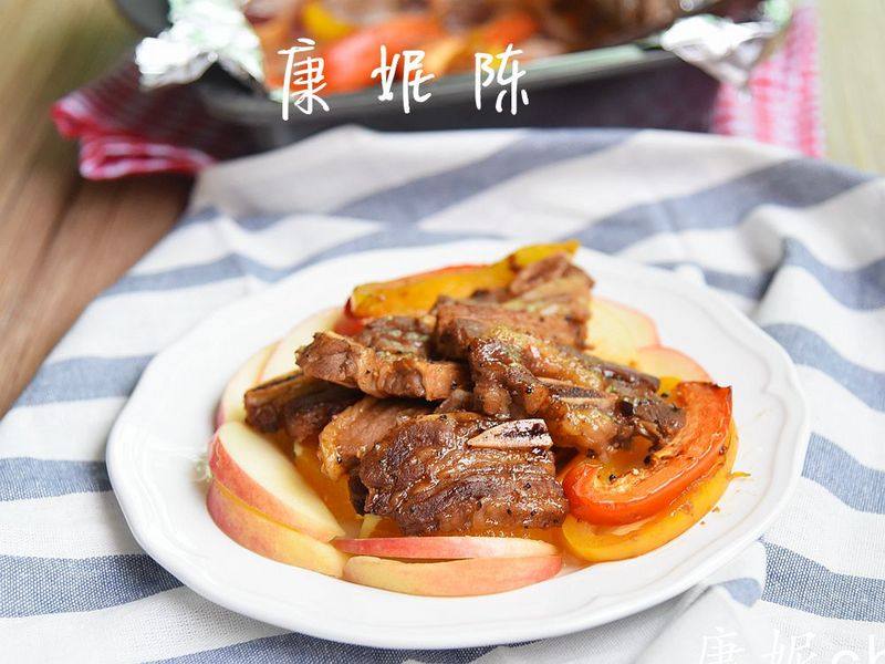 1:牛仔骨用烤肉酱、黑胡椒汁、黑胡椒和孜然粉拌匀,腌制1小时或以上