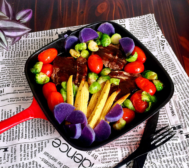 牛仔骨180克;玉米笋2个;孢子甘蓝10个;小番茄5个;紫土豆半个;