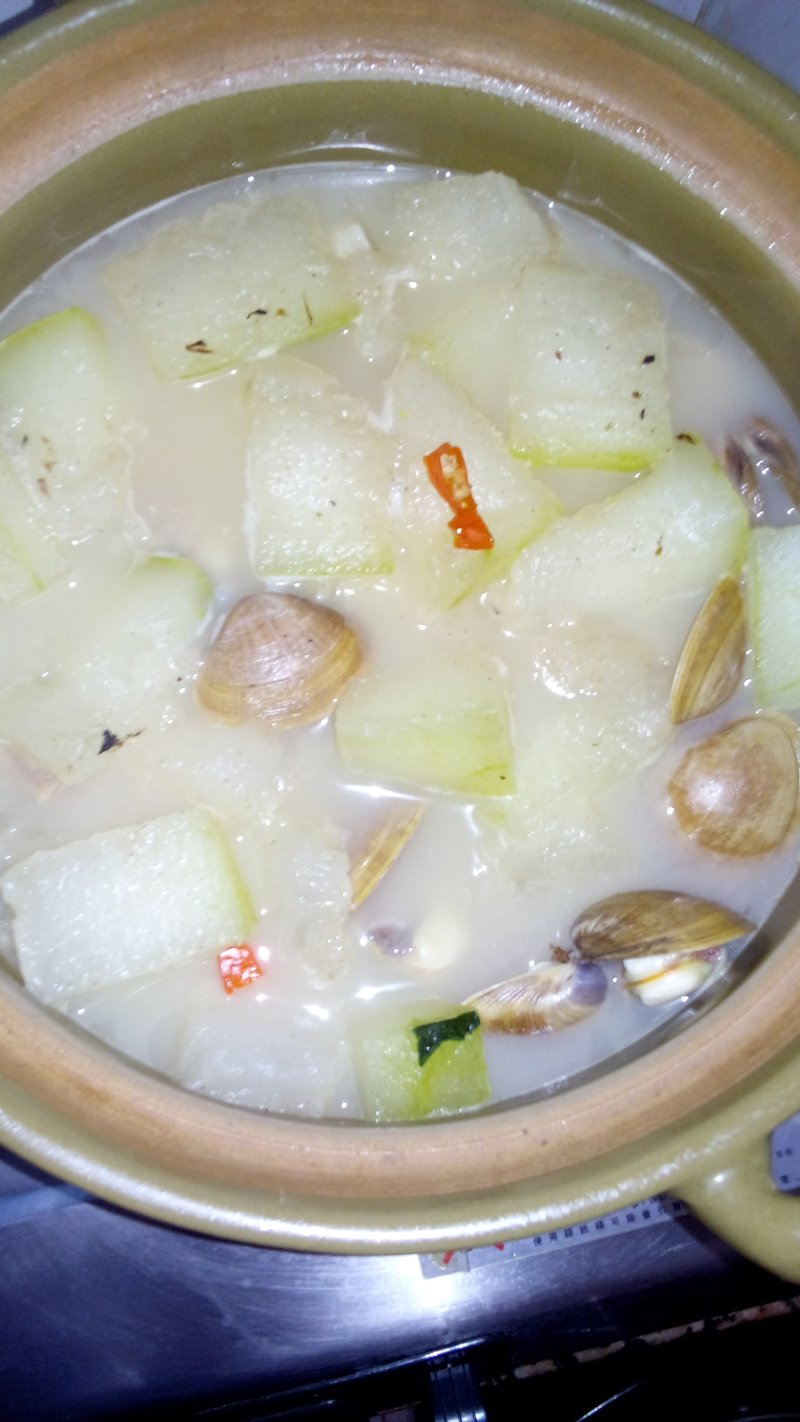 3:蛤锅下油盐下配料蒜,姜炒香下花蛤爆香下白酒,下胡椒粉下冬瓜炒,再下水煮滚后,将其倒进砂锅里煮.