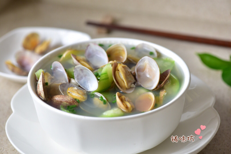 3:水中放盐巴,胡椒粉麻油,盖上盖子让它煮滚,关火加味精,撒上葱花,鲜美的丝瓜花蛤汤就出锅咯
