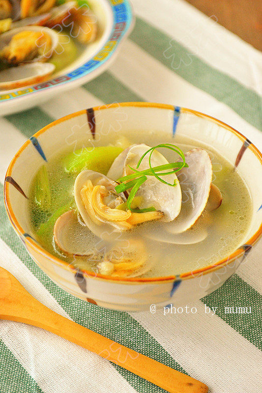 8:汤烧开后,,花蛤也打开了,就熟了。(成品)