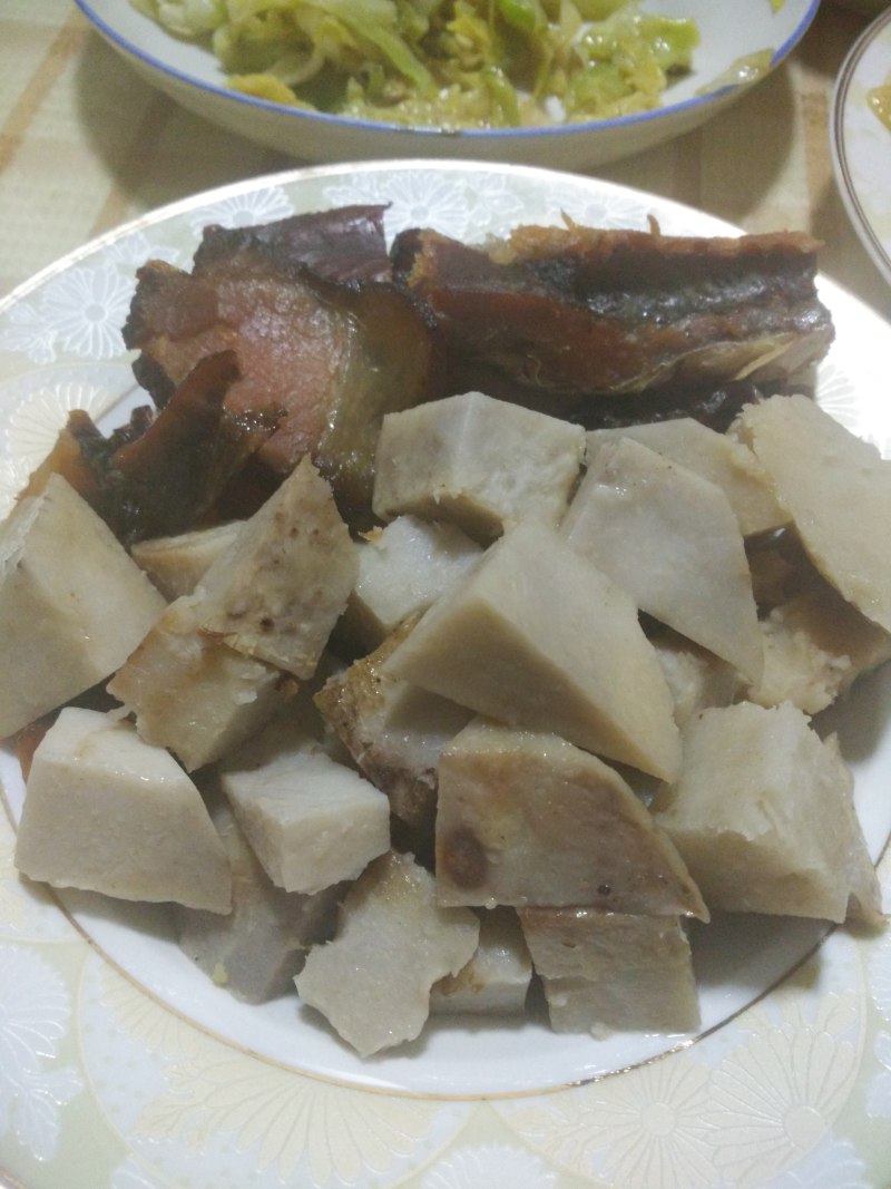 1:准备主要的原料,有芋头,腊肉和鱼鲞。