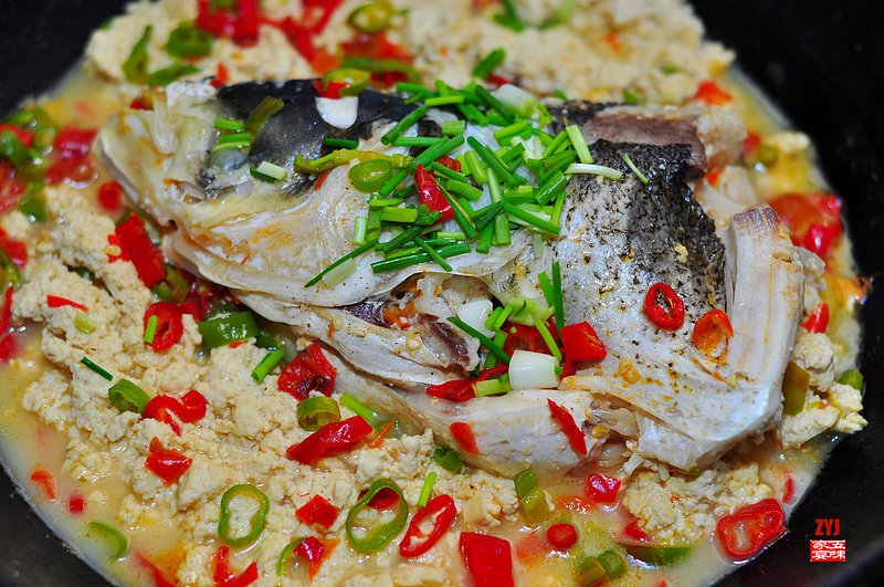 1:鱼头去鳃去鳞洗净沥干水分或擦干,将鱼头两面淋上热油备用