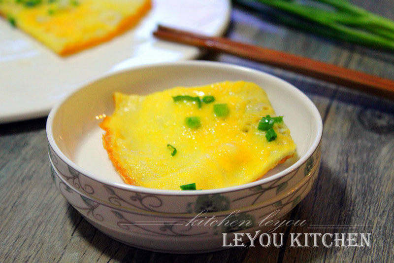 4:将蛋液倒入锅中,轻轻转到锅,让蛋液平铺在锅内。小火慢煎。