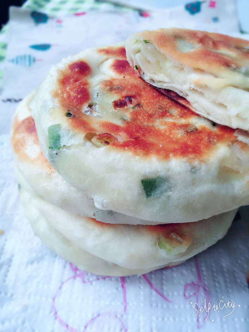 3:平底锅或电饼铛放少量油,饼放锅中,翻!外酥里嫩!
