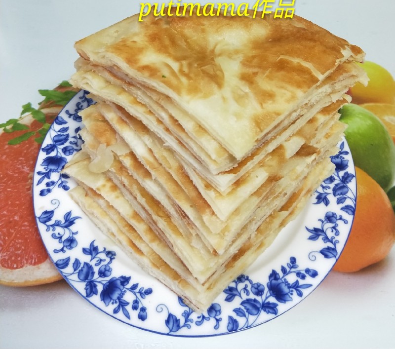 之所以撒入一些干面粉,你会发现烙出来的烙饼层数比单纯卷起的烙饼多好多层呢,许是油和干粉的作用,总之这样烙出来的烙饼口感非常好,外皮酥香,内里有层次。