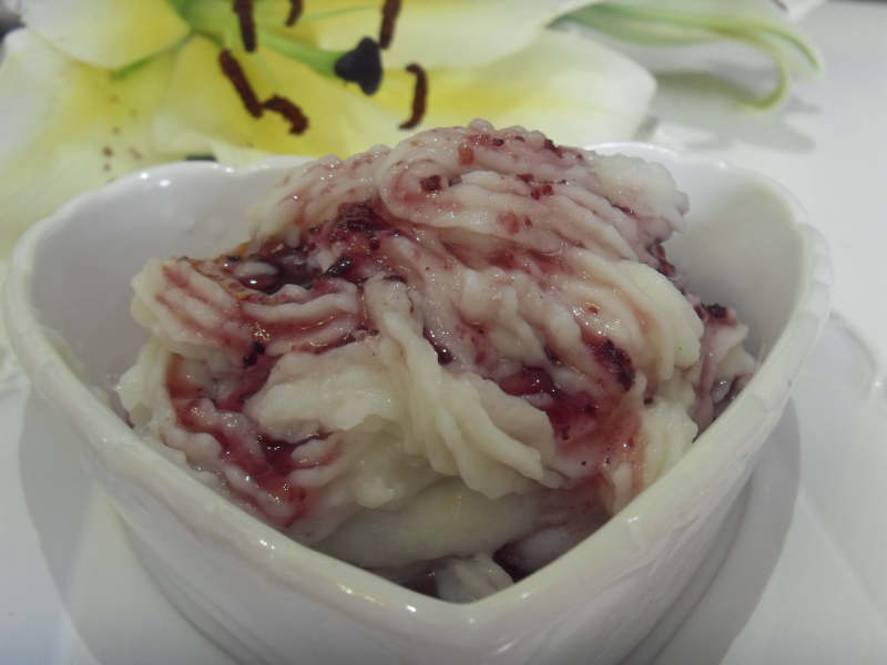10:最后把蓝莓果酱淋在土豆泥上即可。