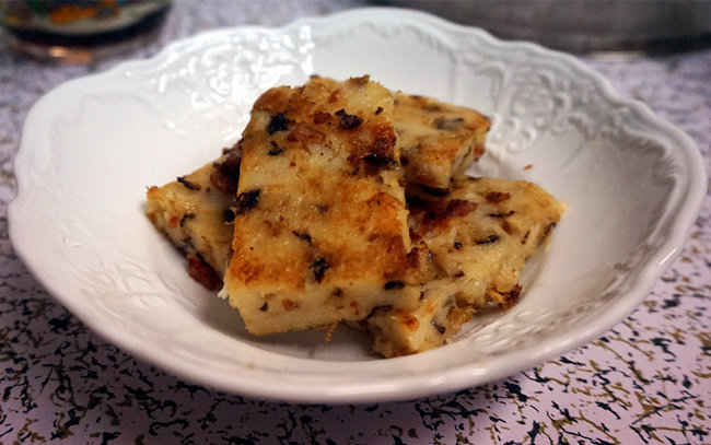 11:蒸好的萝卜糕彻底放凉后再脱模,切片。