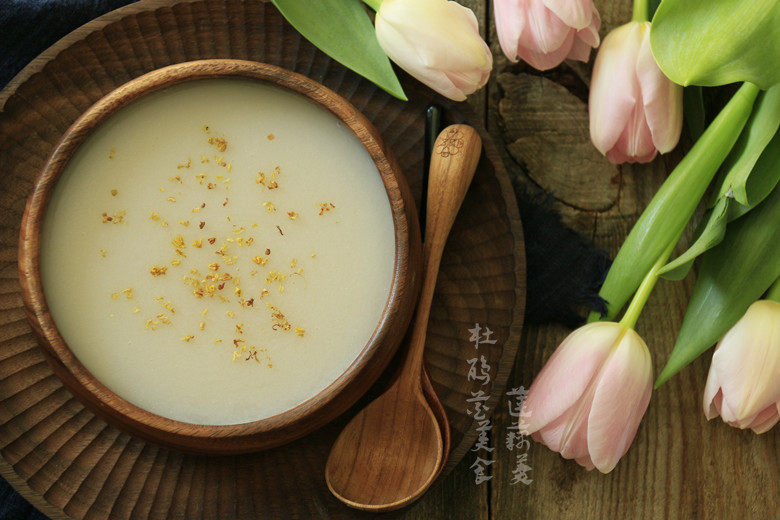 6:煮好的莲藕羹加入2勺糖桂花调味,然后在撒少许干桂花提香气。糖桂花就是桂花酱,比较甜又有桂花的香味,放到莲藕羹里味道很好。也可以根据个人口感加入玫瑰酱。