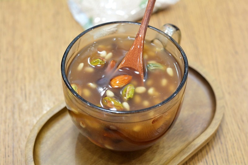 开心果1撮;大桃仁1撮;松仁1撮;蔓越莓干1撮;开水300毫升;