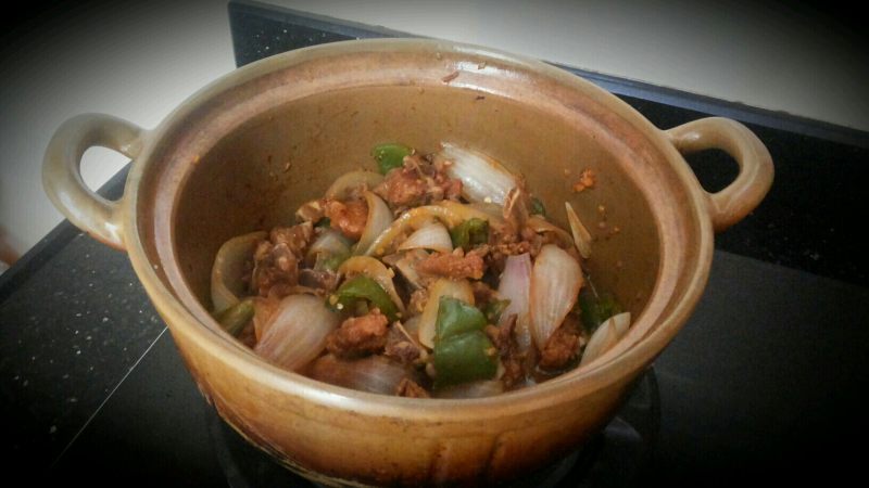 5:洋葱垫底炒香,然后放入腌制好的排骨和剩下的啫啫酱。