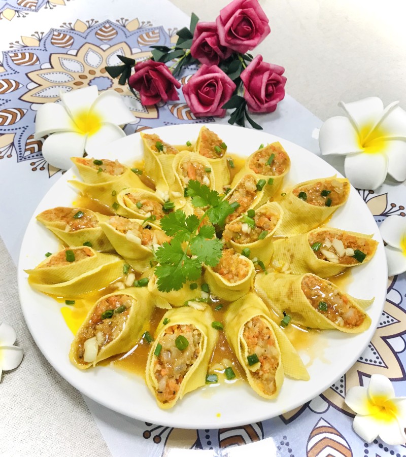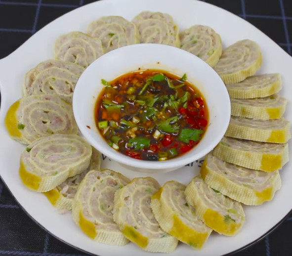 12:半碗水、生粉、酱油、蚝油勾芡淋上蒸熟的豆皮卷肉。