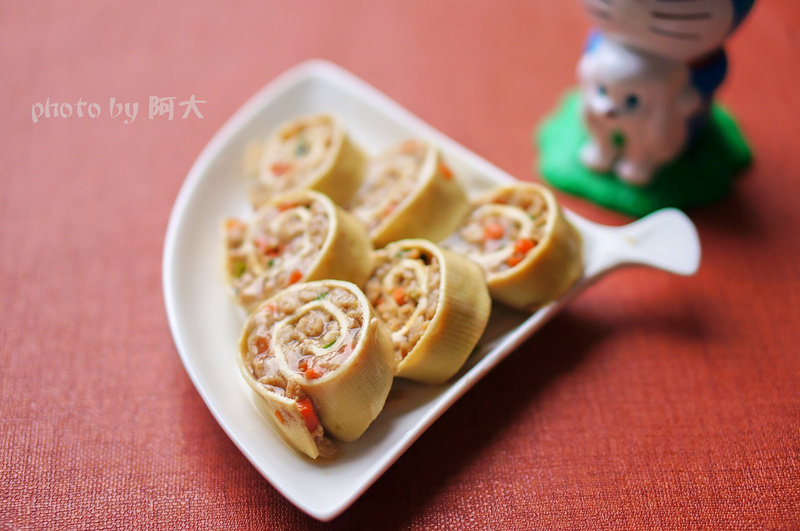 豆腐皮1张;猪肉糜适量;胡萝卜适量;香葱适量;