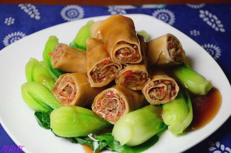 9:菜心焯水,用菜心围边,腐皮卷切段放上面