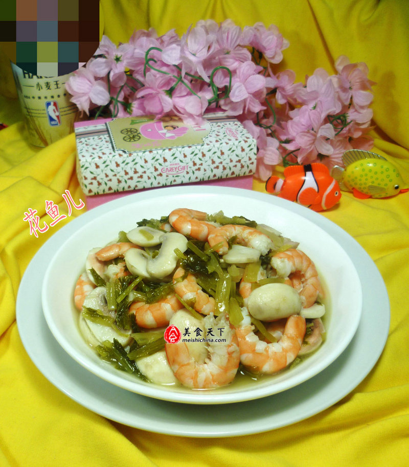 1:食材:白灼虾、蘑菇(已清洗)、雪菜(已清洗)