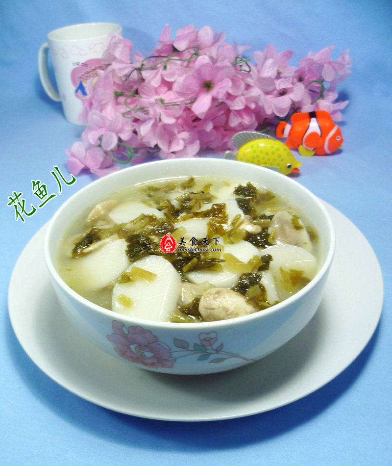5:在排骨汤中放入蘑菇,雪里蕻,少许盐煮制。