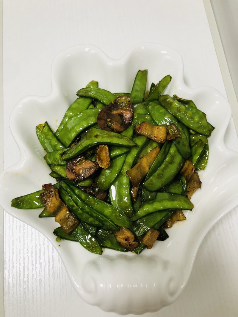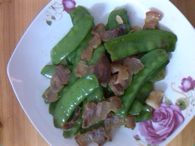 4:放入荷兰豆和腊肉一起翻炒,加盐调味,荷兰豆熟透即可起锅,这个过程中可以加少许水,荷兰豆熟得快些。