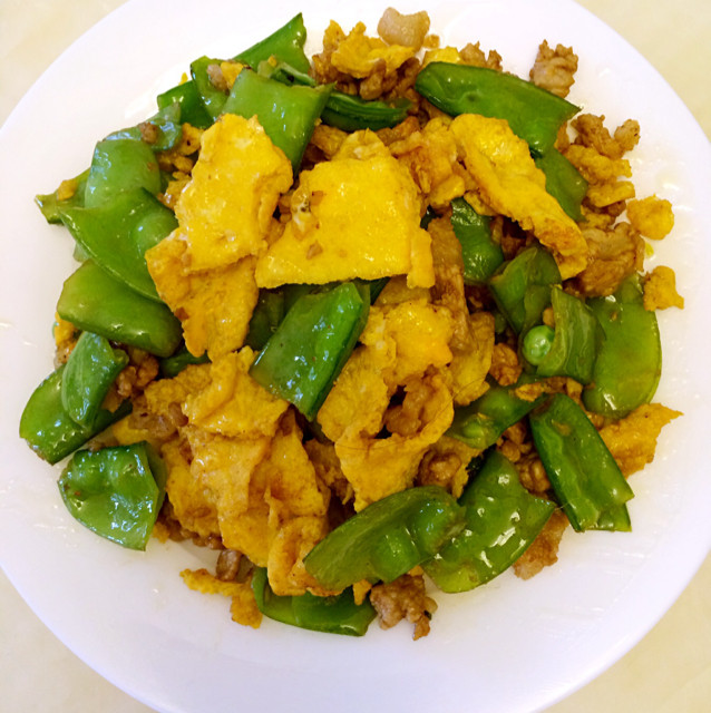 6:倒入荷兰豆翻炒,加些水煮熟豆子。