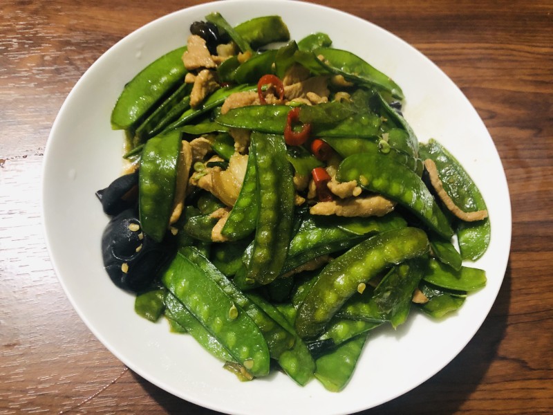 5:放入荷兰豆鲜木耳,木耳我放的有些少了,就剩这几朵了。