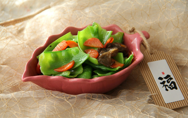 4:依次放入胡萝卜、木耳和荷兰豆,