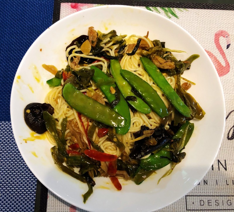 1:备料:荷兰豆掐头去尾,少量木耳,猪肉切丝,小米辣和香葱切段,蒜拍一下去皮就好(省的不喜欢吃蒜的无意中吃到蒜末)。