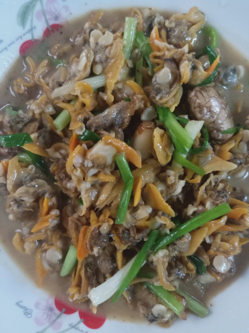 5:锅中放入植物油烧热,依次倒入春笋丝,韭菜,螺蛳肉翻炒2分钟左右,加入盐和鸡精即可。