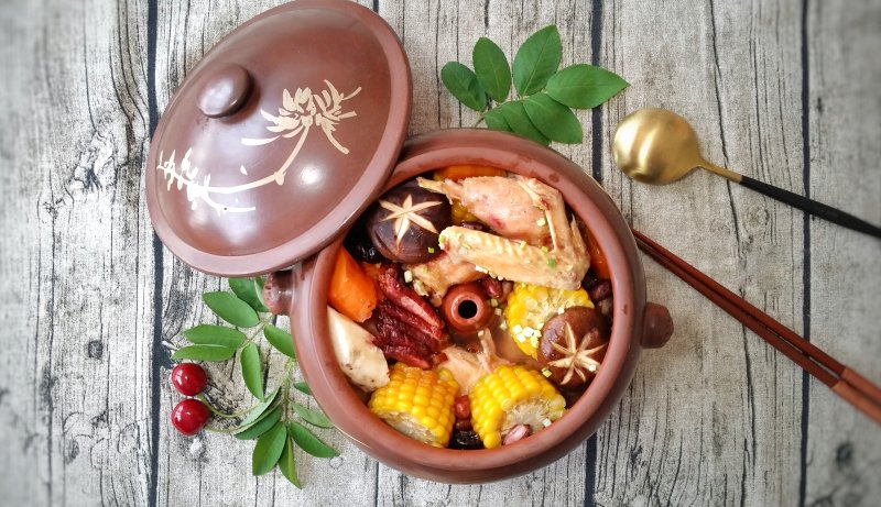 绿色有机童子鸡1只;熏腊肉4~5片;香菇两朵;玉米半根;胡萝卜半根;山药半根;红枣几颗;红皮花生一小把;枸杞十几粒;姜片2-3片;小葱两根;