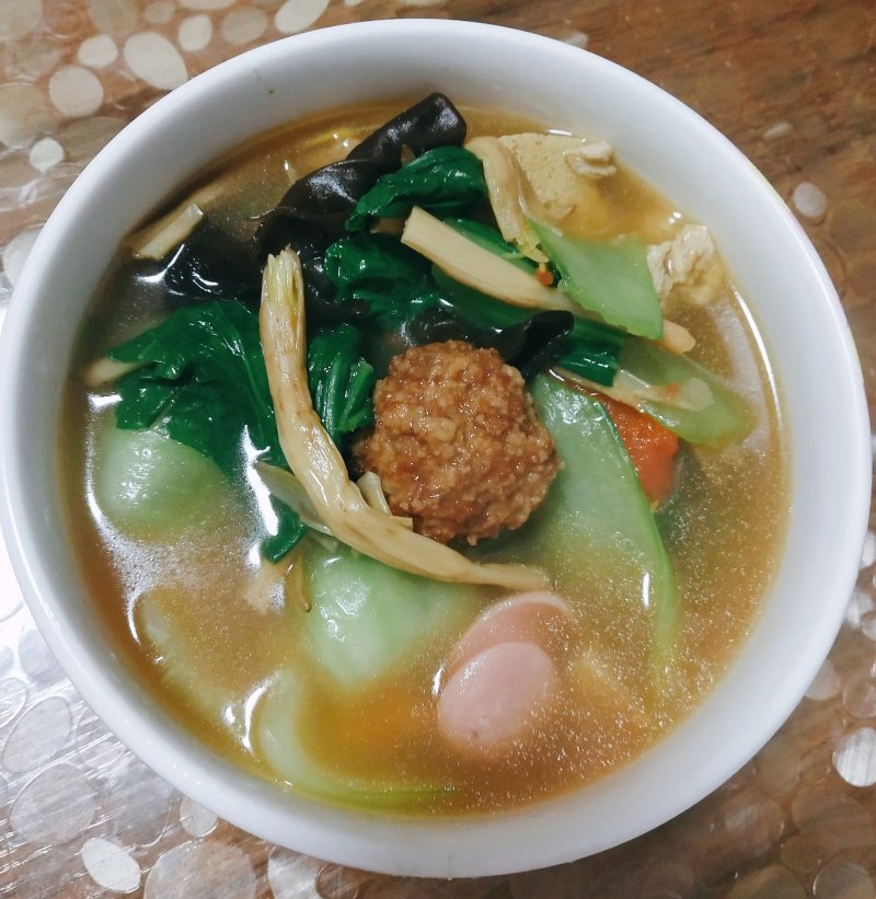 丸子5个;冻豆腐半块;台湾烤肠2根;西红柿半个;木耳一小把;黄花菜一小把;小油菜两棵;