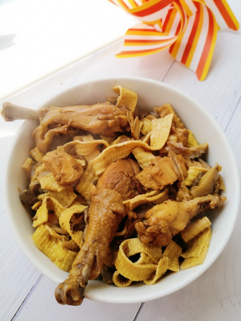 鸡1只;平菇200克;豆腐皮100克;