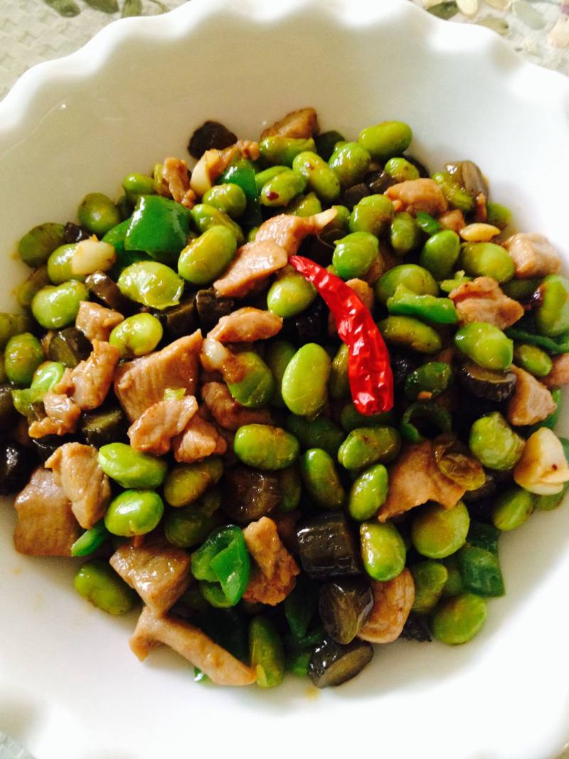 3:再将毛豆炒至成熟,顺序加入酱瓜丁,肉丁,烹少许料酒或清水,收干即可出锅。