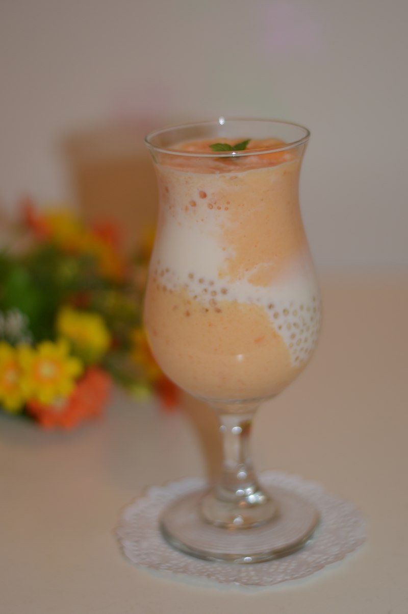 7:倒入酸奶,倒入木瓜泥,杯子上面摆点木瓜块。
