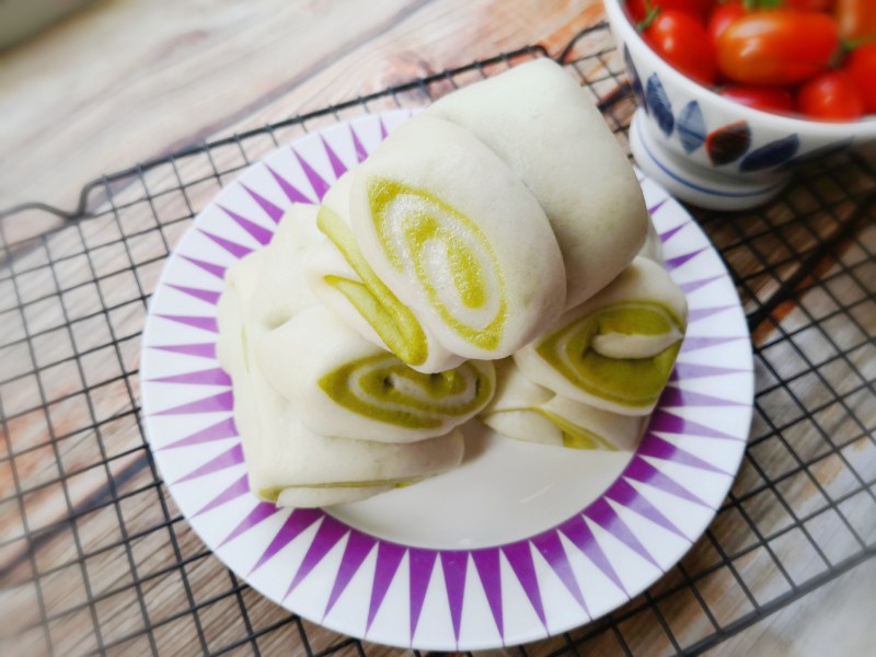 6:把绿色面团放到白色面团上,再撒些干面粉,慢慢卷起来。