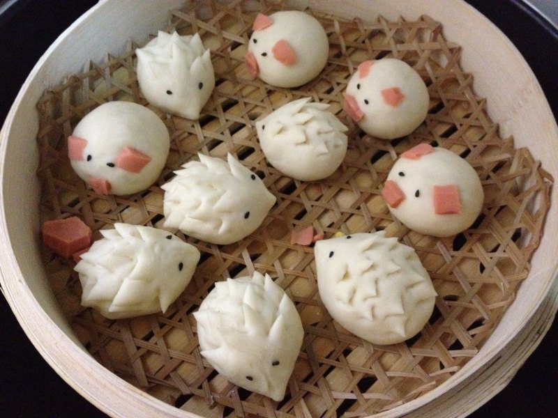 3:然后把面团取出来,排气,再搓圆。用剪刀顺一个方向剪出小刺猬的小刺,黑芝麻做眼睛;火腿肠剪小片贴在面团上做鼻子、耳朵,不用很逼真,贴上去就会像样的!然后放蒸笼,塑性的时候刚好足够醒发,所以开始蒸了