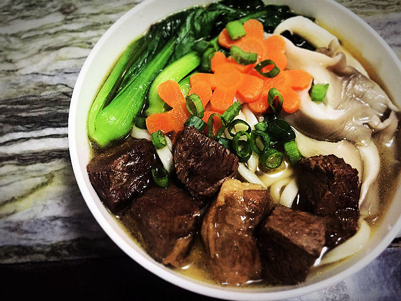 8:准备一个碗,倒入第一步炖好的羊肉汤一大勺和第四步炖好的汤汁一勺,把下好的面捞到碗里,青菜,蘑菇,胡萝卜,羊肉,依次放入碗里,撒上葱花(如果觉得味道淡,第四步的汤汁可以多方一点)开吃。