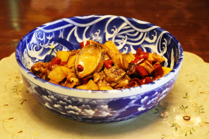 2:锅里加油烧热,加姜片、干辣椒爆香,加鸡块,加料酒、生抽、老抽、蚝油爆炒,加香菇继续翻炒,加适量水,放入土豆,大火煮开转中火,放入鲍鱼煮到收汁即可。