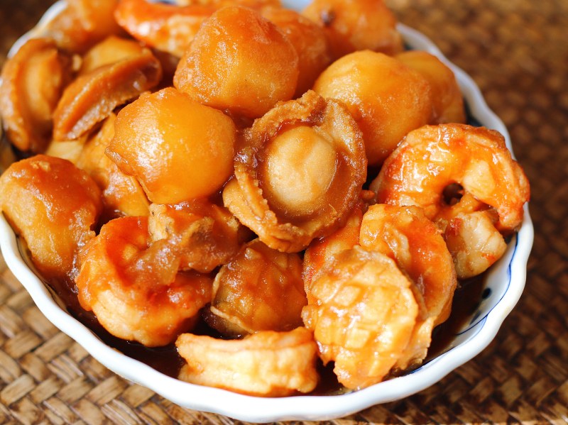 小土豆250克;小鲍鱼10个;海虾6只;