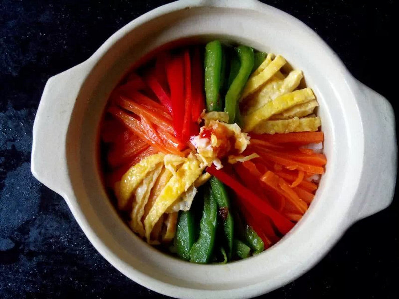 14:煎好鸡蛋放入砂锅中,焖饭完成了!