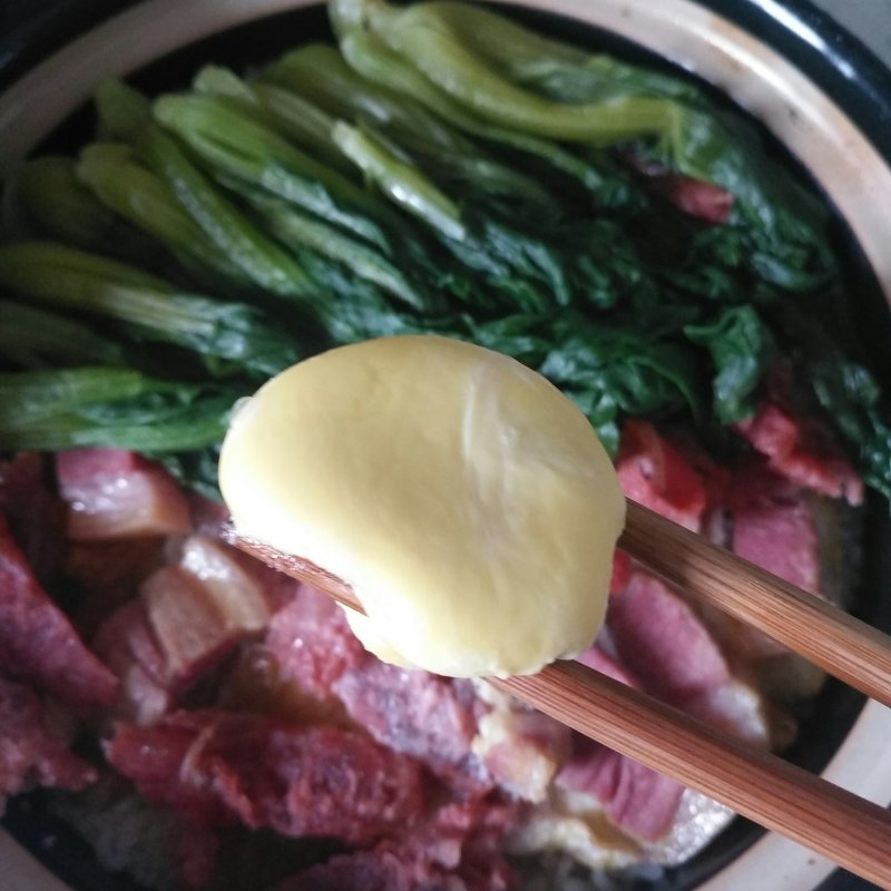 大米300克;广东腊肠3根;腊肉100克;小青菜1把;鸡蛋1个;