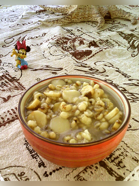 4:小米煮开10分钟后放入山药,继续煮约30分钟。