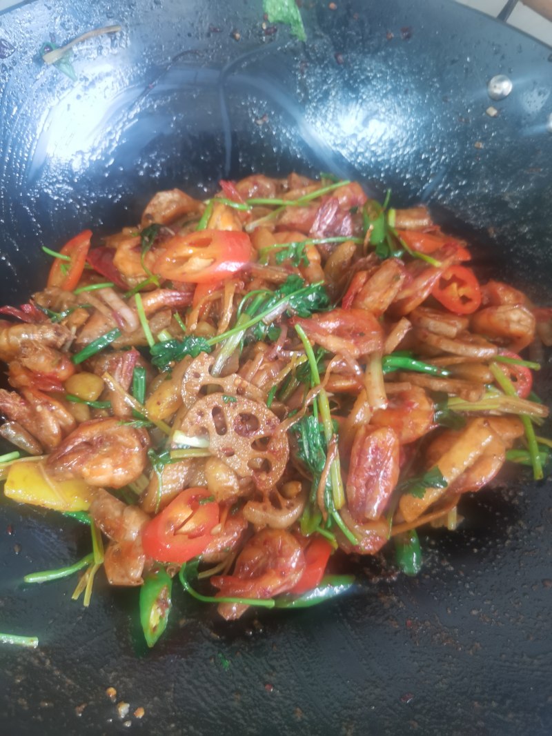 7:炒香之后放入炸号的虾和配菜,翻炒之后放入少许盐,蚝油,鲜抽,白糖提鲜,再放入切好的青红椒,芹菜,出锅前放入葱段,香菜即可。