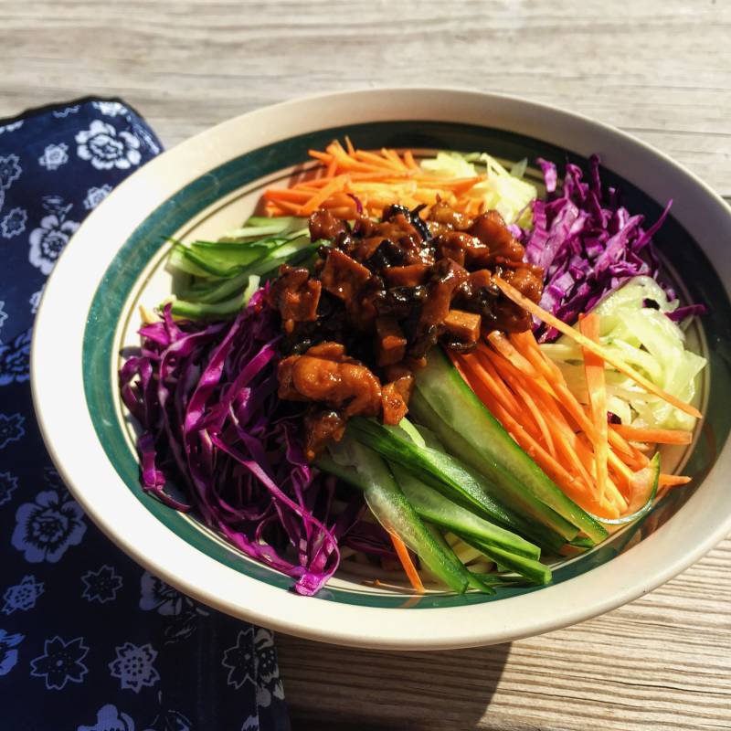 1:准备好配菜(八宝):黄瓜皮丝,黄瓜瓤丝,紫甘蓝丝,胡萝卜丝;鸡肉丁,豆干丁,香菇丁,木耳碎。