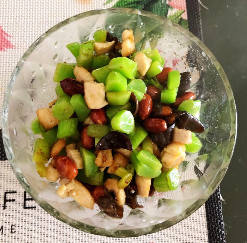 1:鸡肉、莴笋、木耳切成丁备用。花生在微波炉里五分钟打脆。