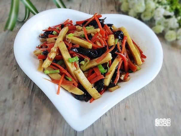 1:水发黑木耳洗净后切成木耳丝。
