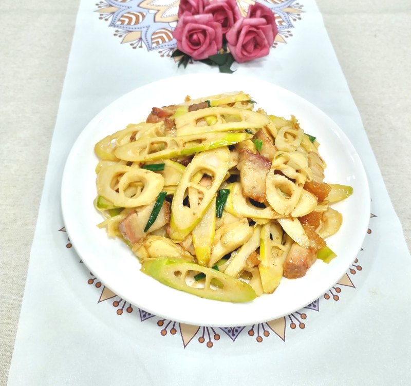 11:肉块炒得略微硬一些,并且肥肉部分呈透明状时,将笋块入锅中,同翻炒
