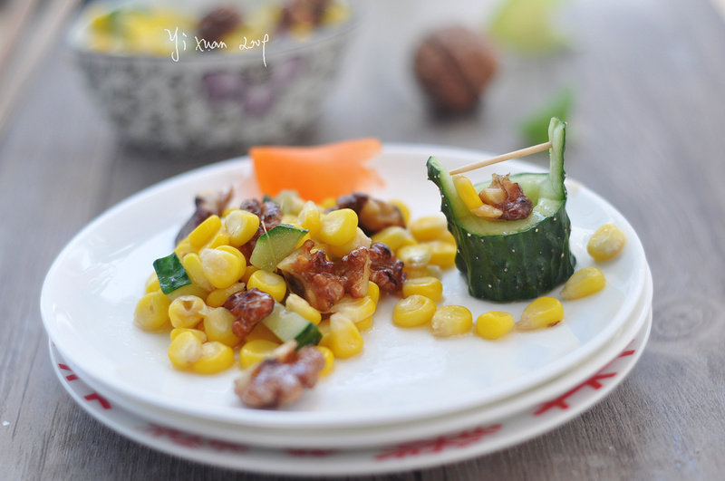 玉米200g;青瓜50g;核桃仁50g;