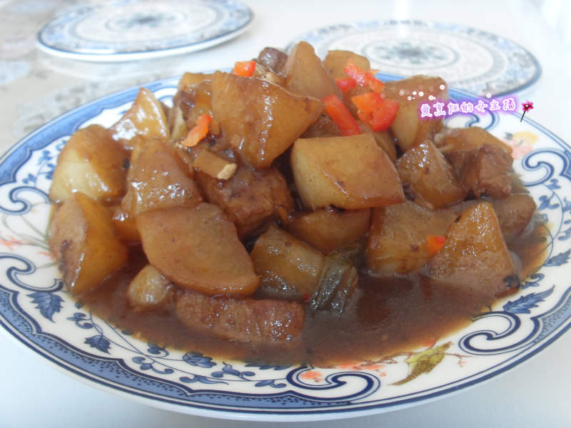 9:五花肉炖制40分钟后倒入萝卜,炖制20分钟后调入精盐收汁。