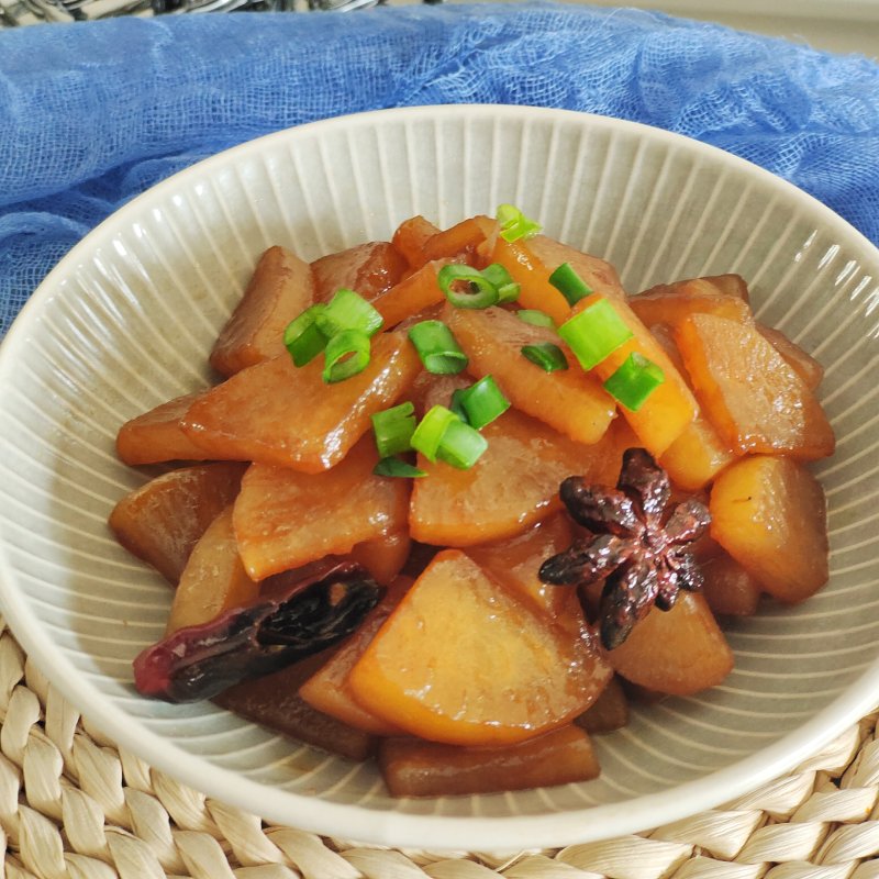 白萝卜1小根;生抽2小勺;蚝油2小勺;姜2片;八角1个;香油适量;