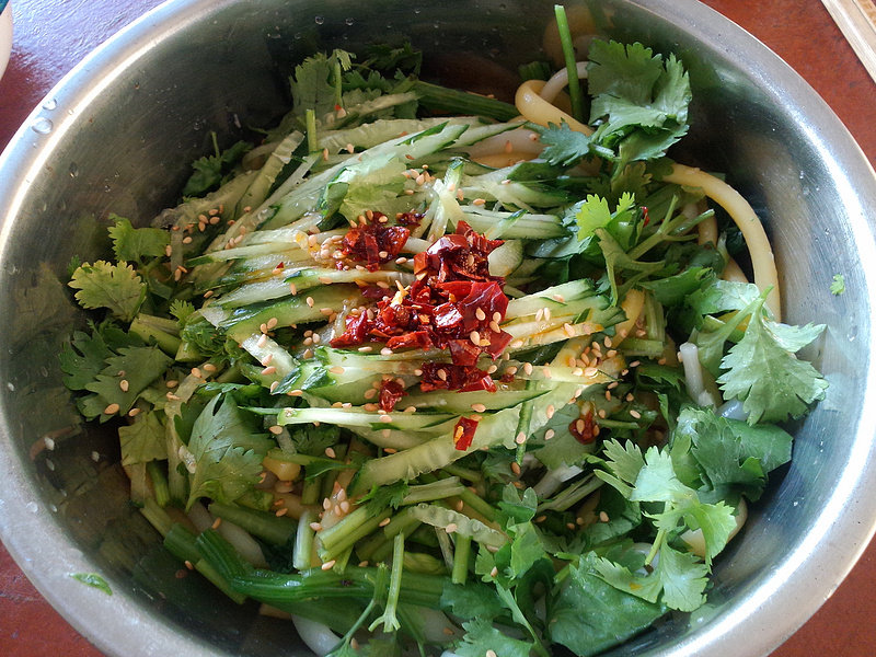 牛筋面适量;菠菜适量;香菜适量;黄瓜适量;